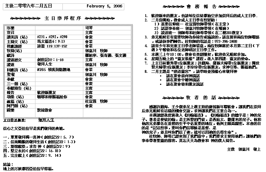 Sunday worship starts at 10AM, followed by sunday school at 11:30AM and luncheon at 12:30PM. If you would like to know Jesus, plese join us and change your life!.