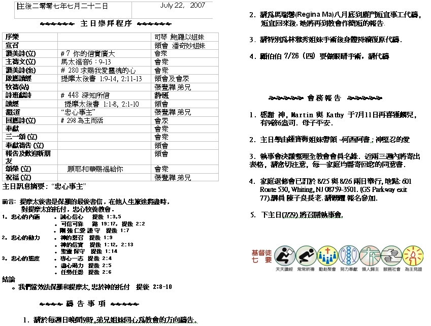 Sunday worship starts at 10AM, followed by sunday school at 11:30AM and luncheon at 12:30PM. If you would like to know Jesus, plese join us and change your life!.