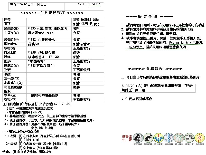 Sunday worship starts at 10AM, followed by sunday school at 11:30AM and luncheon at 12:30PM. If you would like to know Jesus, plese join us and change your life!.