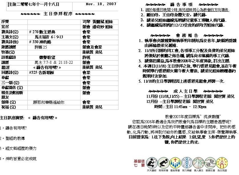 Sunday worship starts at 10AM, followed by sunday school at 11:30AM and luncheon at 12:30PM. If you would like to know Jesus, plese join us and change your life!.