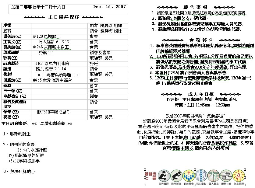 Sunday worship starts at 10AM, followed by sunday school at 11:30AM and luncheon at 12:30PM. If you would like to know Jesus, plese join us and change your life!.