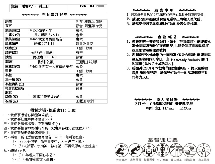 Sunday worship starts at 10AM, followed by sunday school at 11:30AM and luncheon at 12:30PM. If you would like to know Jesus, plese join us and change your life!.