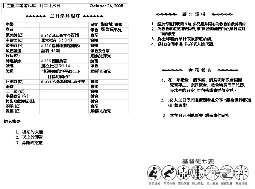 Sunday worship starts at 10AM, followed by sunday school at 11:30AM and luncheon at 12:30PM. If you would like to know Jesus, plese join us and change your life!.
