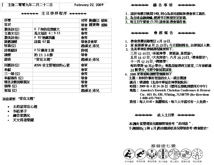 Sunday worship starts at 10AM, followed by sunday school at 11:30AM and luncheon at 12:30PM. If you would like to know Jesus, plese join us and change your life!.