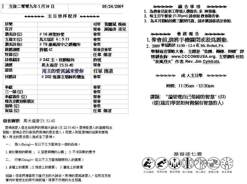 Sunday worship starts at 10AM, followed by sunday school at 11:30AM and luncheon at 12:30PM. If you would like to know Jesus, plese join us and change your life!.