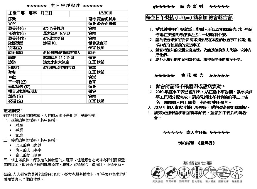 Sunday worship starts at 10AM, followed by sunday school at 11:30AM and luncheon at 12:30PM. If you would like to know Jesus, plese join us and change your life!.