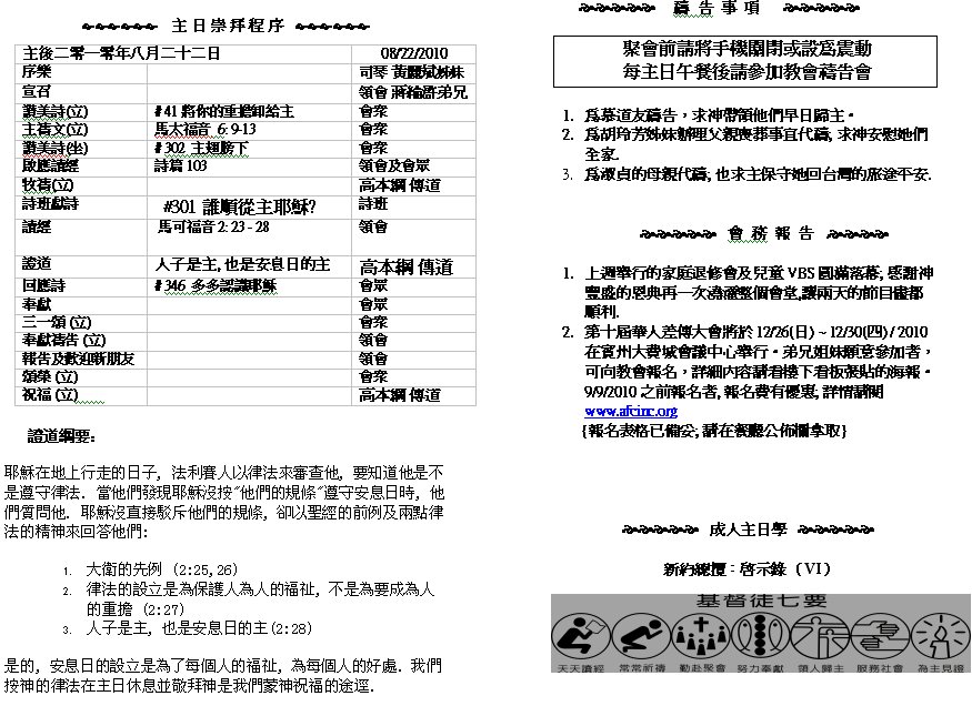 Sunday worship starts at 10AM, followed by sunday school at 11:30AM and luncheon at 12:30PM. If you would like to know Jesus, plese join us and change your life!.