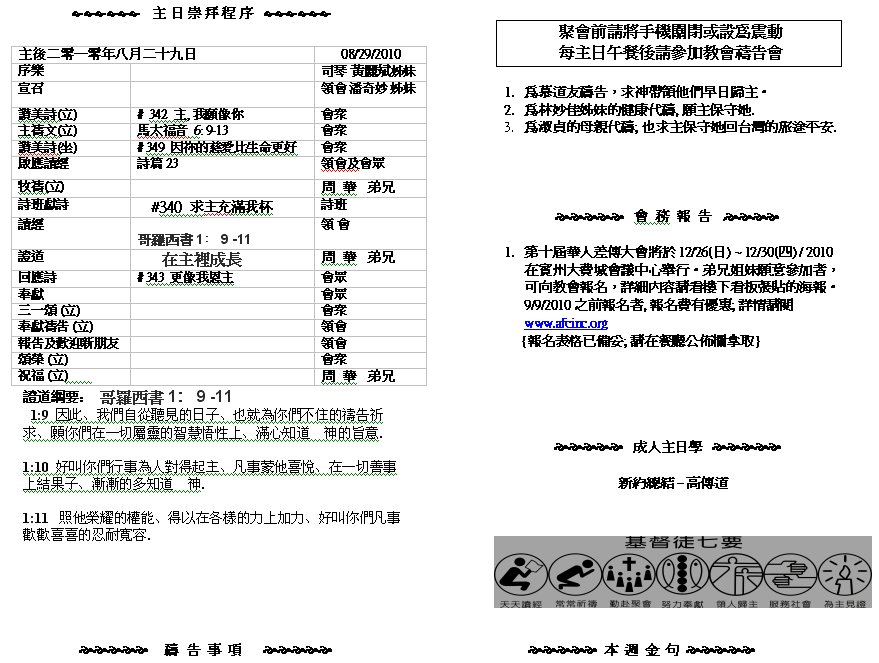 Sunday worship starts at 10AM, followed by sunday school at 11:30AM and luncheon at 12:30PM. If you would like to know Jesus, plese join us and change your life!.