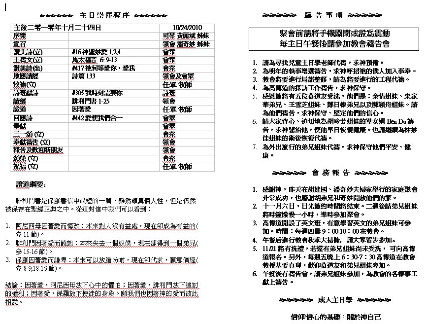 Sunday worship starts at 10AM, followed by sunday school at 11:30AM and luncheon at 12:30PM. If you would like to know Jesus, plese join us and change your life!.