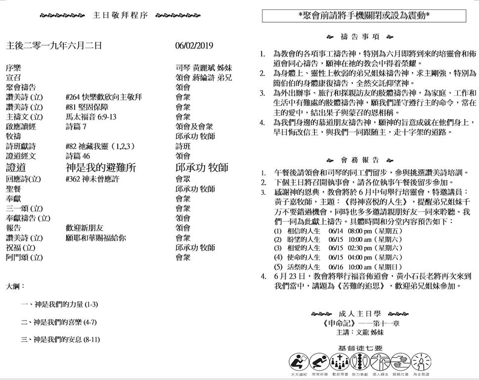 Sunday worship starts at 10AM, followed by sunday school at 11:30AM and luncheon at 12:30PM. If you would like to know Jesus, plese join us and change your life!.