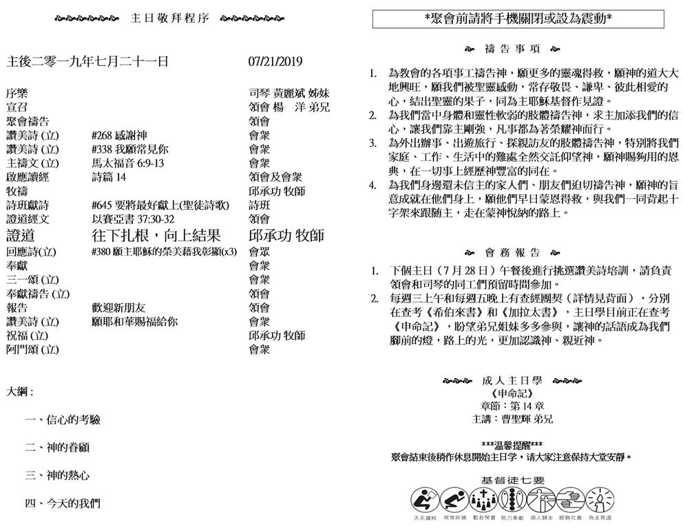 Sunday worship starts at 10AM, followed by sunday school at 11:30AM and luncheon at 12:30PM. If you would like to know Jesus, plese join us and change your life!.