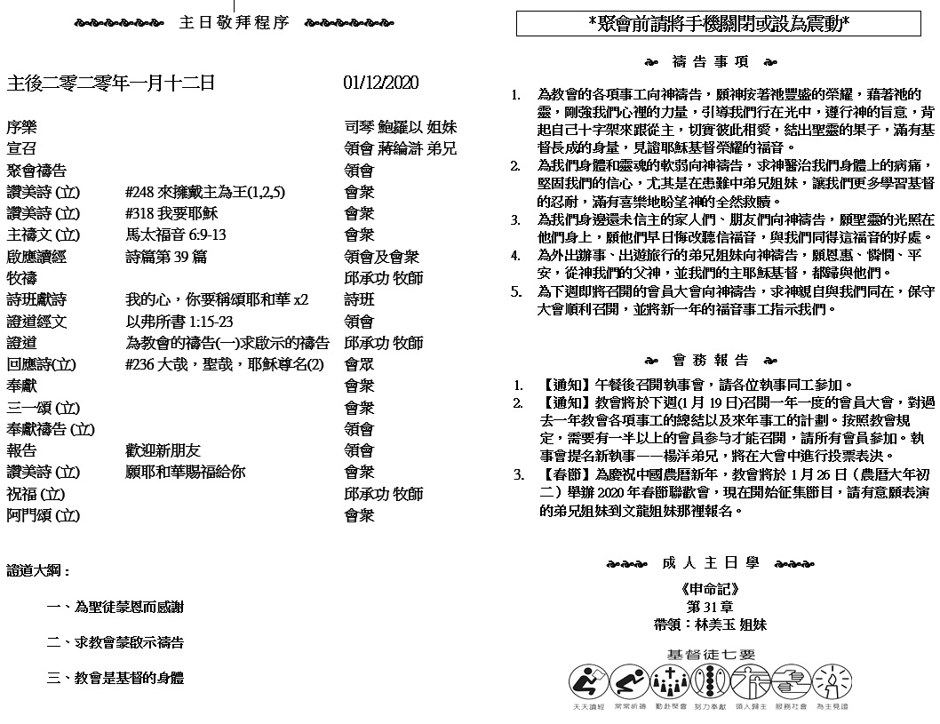 主日崇拜 10:00AM - 11:25 AM  ; 主日学 11:30AM - 12:30PM