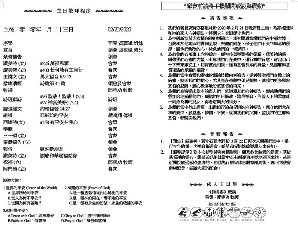 主日崇拜 10:00AM - 11:25 AM  ; 主日学 11:30AM - 12:30PM