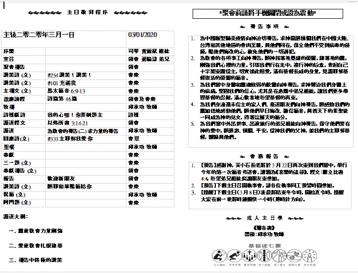 主日崇拜 10:00AM - 11:25 AM  ; 主日学 11:30AM - 12:30PM