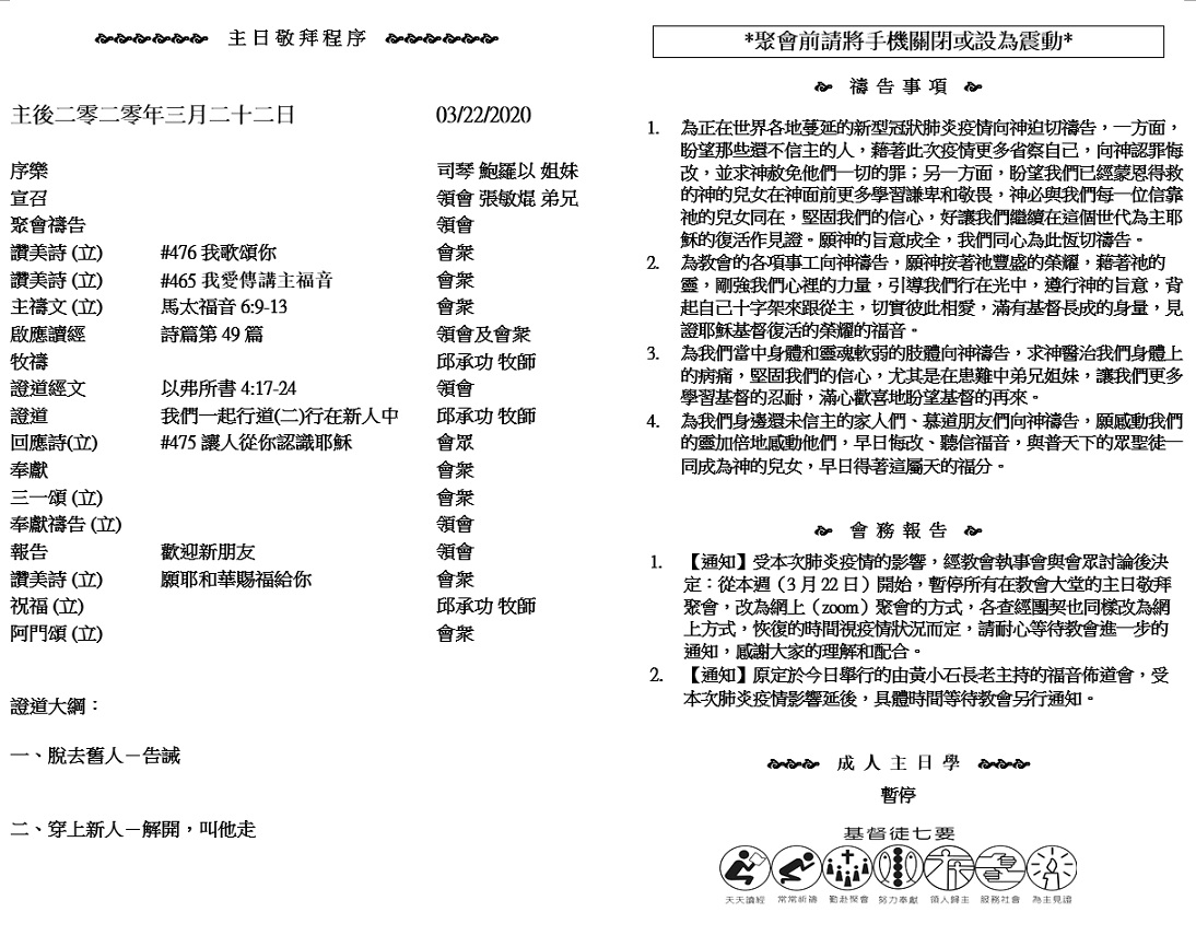 主日崇拜 10:00AM - 11:25 AM  ; 主日学 11:30AM - 12:30PM