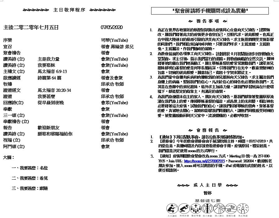 主日崇拜 10:00AM - 11:25 AM  ; 主日学 11:30AM - 12:30PM 青少年 10:00AM - 12:00PM ; 午餐 12:30M - 1:30PM 疫情時期教會的聚會暂时用ZOOM网上聚会型式, 歡迎新老朋友参加! https://zoom.us/j/2570007935 我实实在在地告诉你们,信的人有永生。我就是生命的粮。 你们的祖宗在旷野吃过吗哪,还是死了。这是从天上降下来的粮,叫人吃了就不死。我是从天上降下来生命的粮;人若吃这粮,就必永远活着。我所要赐的粮就是我的肉,为世人之生命所赐的。 (约翰福音 6:47-51)