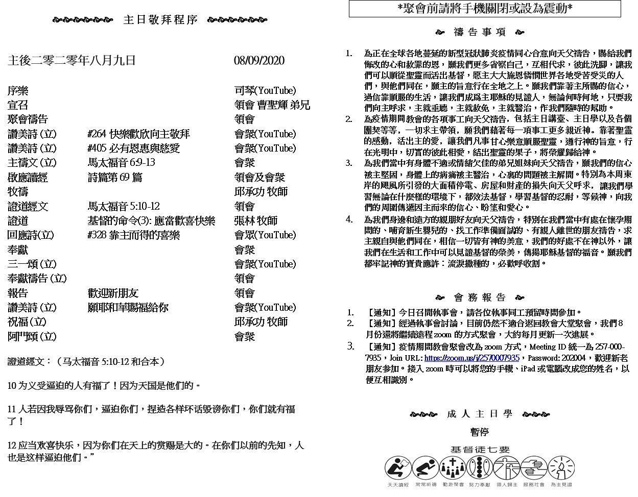 主日崇拜 10:00AM - 11:25 AM  ; 主日学 11:30AM - 12:30PM 青少年 10:00AM - 12:00PM ; 午餐 12:30M - 1:30PM 疫情時期教會的聚會暂时用ZOOM网上聚会型式, 歡迎新老朋友参加! https://zoom.us/j/2570007935 惟有详细察看那全备、使人自由之律法的,并且时常如此,这人既不是听了就忘,乃是实在行出来,就在他所行的事上必然得福。若有人自以为虔诚,却不勒住他的舌头,反欺哄自己的心,这人的虔诚是虚的。在 神我们的父面前,那清洁没有玷污的虔诚,就是看顾在患难中的孤儿寡妇,并且保守自己不沾染世俗。 (雅各书 1:25-27 )