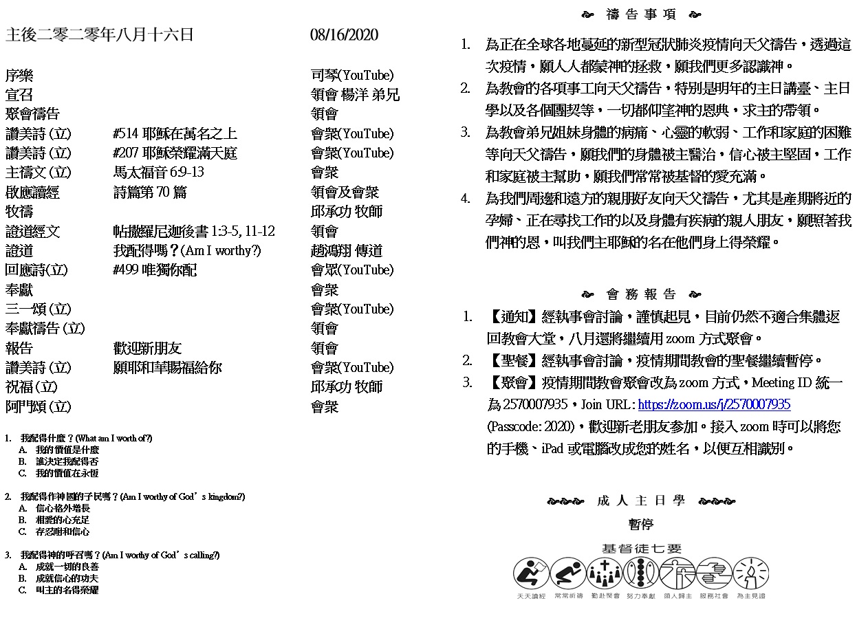 主日崇拜 10:00AM - 11:25 AM  ; 主日学 11:30AM - 12:30PM 青少年 10:00AM - 12:00PM ; 午餐 12:30M - 1:30PM 疫情時期教會的聚會暂时用ZOOM网上聚会型式, 歡迎新老朋友参加! https://zoom.us/j/2570007935 亲爱的弟兄啊,有一件事你们不可忘记,就是主看一日如千年,千年如一日。 9主所应许的尚未成就,有人以为他是耽延,其实不是耽延,乃是宽容你们,不愿有一人沉沦,乃愿人人都悔改。 10但主的日子要像贼来到一样。那日,天必大有响声废去,有形质的都要被烈火销化,地和其上的物都要烧尽了。 (彼得后书 3:8-10)