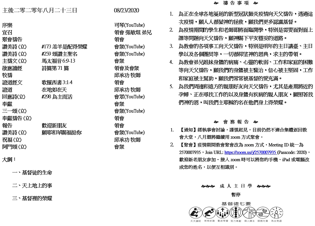 主日崇拜 10:00AM - 11:25 AM  ; 主日学 11:30AM - 12:30PM 青少年 10:00AM - 12:00PM ; 午餐 12:30M - 1:30PM 疫情時期教會的聚會暂时用ZOOM网上聚会型式, 歡迎新老朋友参加! https://zoom.us/j/2570007935 你们蒙了重生,不是由于能坏的种子,乃是由于不能坏的种子,是藉着 神活泼常存的道。 24因为:“凡有血气的,尽都如草;他的美荣都像草上的花。草必枯干,花必凋谢;25惟有主的道是永存的。”所传给你们的福音就是这道。 (彼得前书 1:23-25 )