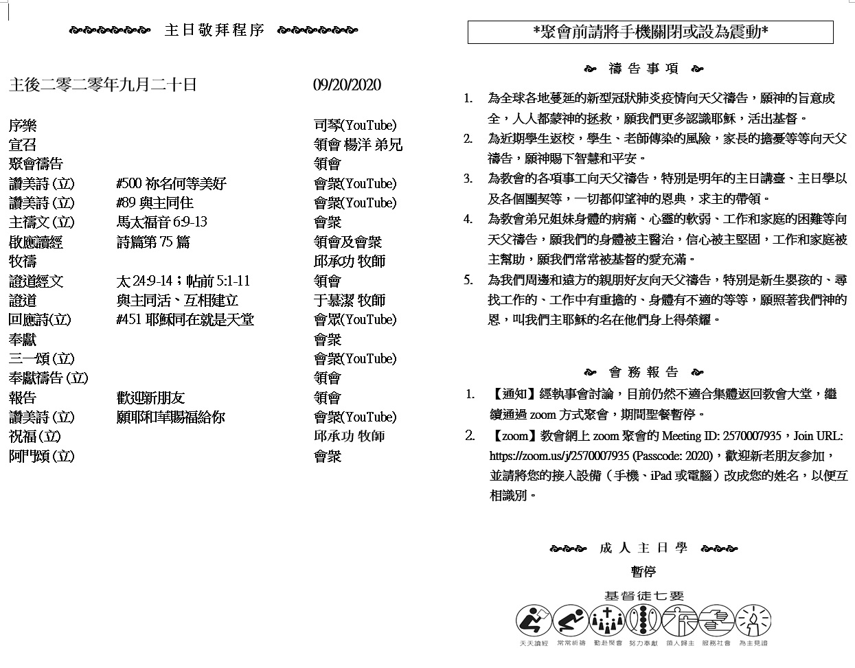 主日崇拜 10:00AM - 11:25 AM  ; 主日学 11:30AM - 12:30PM 青少年 10:00AM - 12:00PM ; 午餐 12:30M - 1:30PM 疫情時期教會的聚會暂时用ZOOM网上聚会型式, 歡迎新老朋友参加! https://zoom.us/j/2570007935 34太监对腓利说:“请问,先知说这话是指着谁?是指着自己呢?是指着别人呢?” 35腓利就开口从这经上起,对他传讲耶稣。 36二人正往前走,到了有水的地方,太监说:“看哪,这里有水,我受洗有什么妨碍呢?”(有古卷在此有37腓利说:“你若是一心相信,就可以。”他回答说:“我信耶稣基督是 神的儿子。”) 38于是吩咐车站住,腓利和太监二人同下水里去,腓利就给他施洗。 (使徒行传 8:34-36,38)