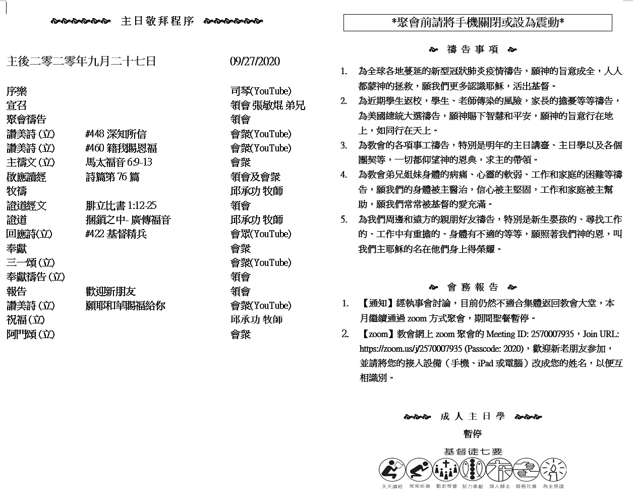 主日崇拜 10:00AM - 11:25 AM  ; 主日学 11:30AM - 12:30PM 青少年 10:00AM - 12:00PM ; 午餐 12:30M - 1:30PM 疫情時期教會的聚會暂时用ZOOM网上聚会型式, 歡迎新老朋友参加! https://zoom.us/j/2570007935 22地極的人都當仰望我,就必得救;因為我是神,再沒有別神。 23我指着自己起誓,我口所出的話是憑公義,並不返回: 萬膝必向我跪拜;萬口必憑我起誓。 (以賽亞書 45:22-23)