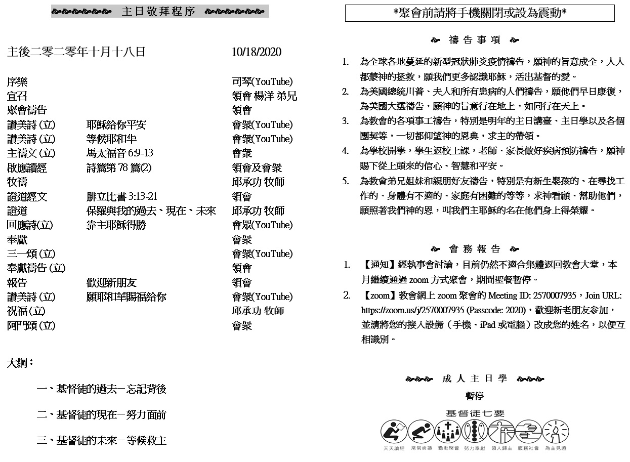 主日崇拜 10:00AM - 11:25 AM  ; 主日学 11:30AM - 12:30PM 青少年 10:00AM - 12:00PM ; 午餐 12:30M - 1:30PM 疫情時期教會的聚會暂时用ZOOM网上聚会型式, 歡迎新老朋友参加! https://zoom.us/j/2570007935 1眷顧貧窮的有福了!他遭難的日子,耶和華必搭救他。2耶和華必保全他,使他存活;他必在地上享福。求你不要把他交給仇敵,遂其所願。3他病重在榻,耶和華必扶持他;他在病中,你必給他鋪牀。 (詩篇 41:1-3)