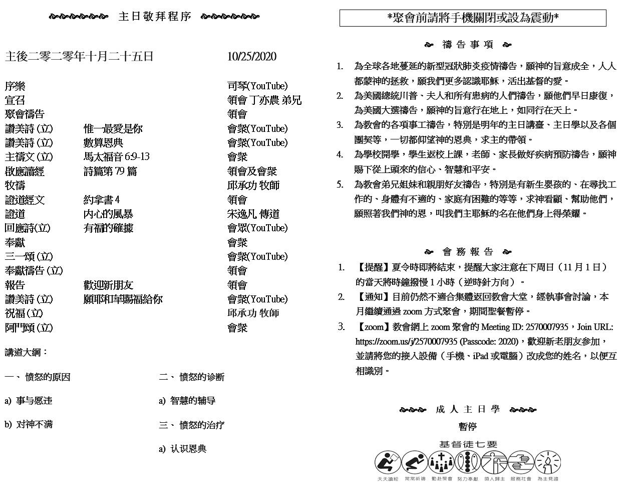 主日崇拜 10:00AM - 11:25 AM  ; 主日学 11:30AM - 12:30PM 青少年 10:00AM - 12:00PM ; 午餐 12:30M - 1:30PM 疫情時期教會的聚會暂时用ZOOM网上聚会型式, 歡迎新老朋友参加! https://zoom.us/j/2570007935 7 親愛的弟兄啊,我們應當彼此相愛,因為愛是從神來的。凡有愛心的,都是由神而生,並且認識神。 8 沒有愛心的,就不認識神,因為神就是愛。 9 神差他獨生子到世間來,使我們藉着他得生,神愛我們的心在此就顯明了。 (約翰一書 4:7-9)