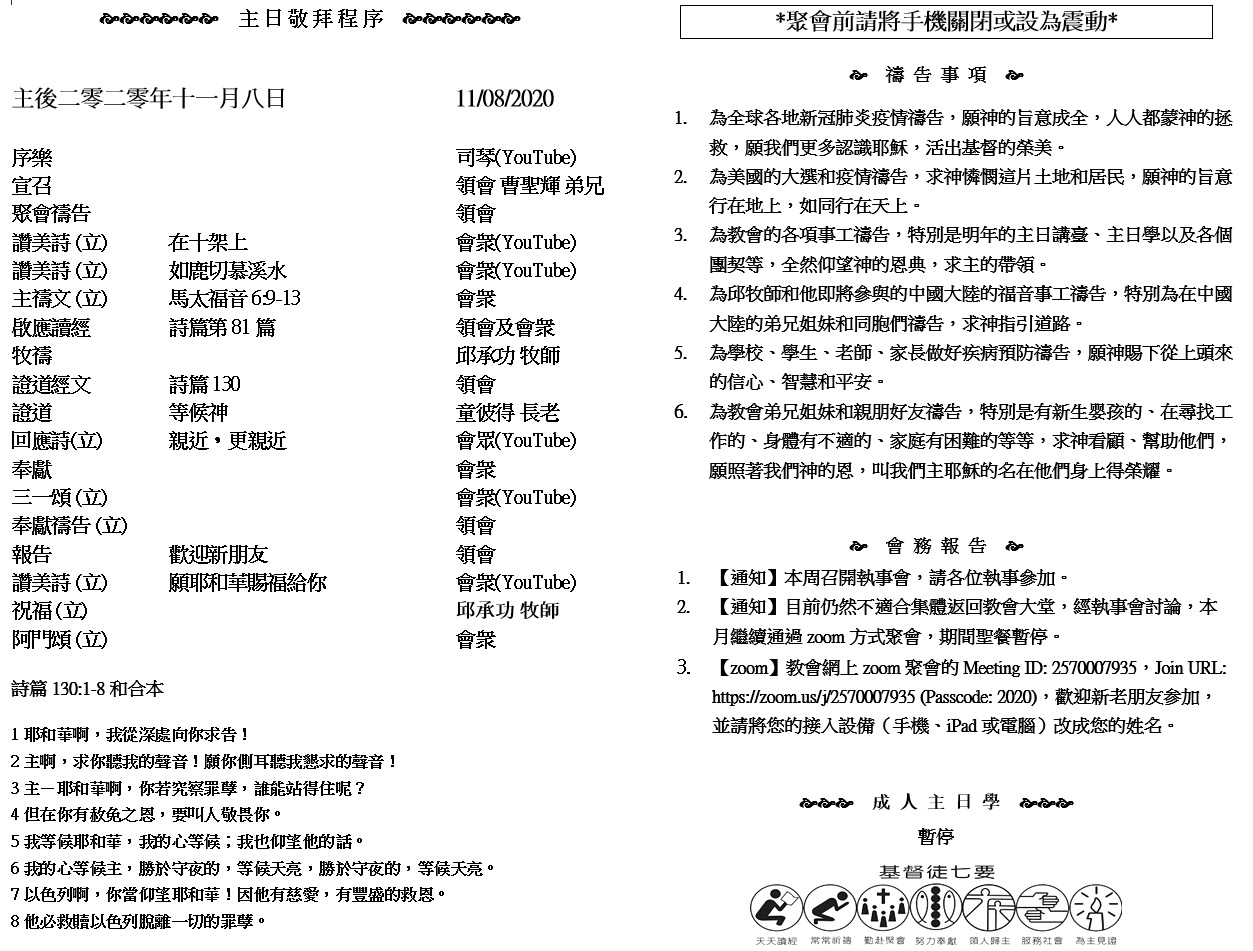 主日崇拜 10:00AM - 11:25 AM  ; 主日学 11:30AM - 12:30PM 青少年 10:00AM - 12:00PM ; 午餐 12:30M - 1:30PM 疫情時期教會的聚會暂时用ZOOM网上聚会型式, 歡迎新老朋友参加! https://zoom.us/j/2570007935 26 神說:「我們要照着我們的形像、按着我們的樣式造人,使他們管理海裏的魚、空中的鳥、地上的牲畜,和全地,並地上所爬的一切昆蟲。」 27 神就照着自己的形像造人,乃是照着他的形像造男造女。 28 神就賜福給他們,又對他們說:「要生養眾多,遍滿地面,治理這地,也要管理海裏的魚、空中的鳥,和地上各樣行動的活物。」。 (創世記 1:26-28)