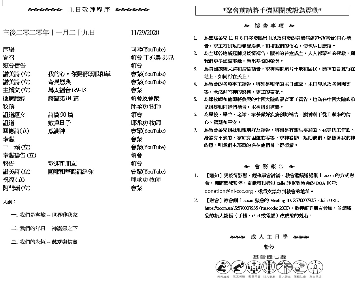 主日崇拜 10:00AM - 11:25 AM  ; 主日学 11:30AM - 12:30PM 青少年 10:00AM - 12:00PM ; 午餐 12:30M - 1:30PM 疫情時期教會的聚會暂时用ZOOM网上聚会型式, 歡迎新老朋友参加! https://zoom.us/j/2570007935 1 这事以后,耶和华在异象中有话对亚伯兰说:“亚伯兰,你不要惧怕!我是你的盾牌,必大大地赏赐你。”……5 于是领他走到外边,说:“你向天观看,数算众星,能数得过来吗?”又对他说:“你的后裔将要如此。” 6 亚伯兰信耶和华,耶和华就以此为他的义。」 (创世记 15:1,4-6)