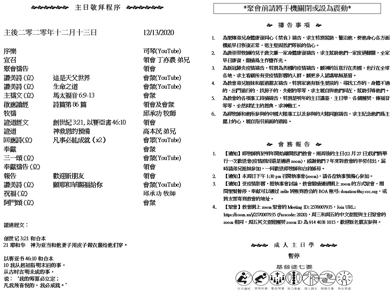 主日崇拜 10:00AM - 11:25 AM  ; 主日学 11:30AM - 12:30PM 青少年 10:00AM - 12:00PM ; 午餐 12:30M - 1:30PM 疫情時期教會的聚會暂时用ZOOM网上聚会型式, 歡迎新老朋友参加! https://zoom.us/j/2570007935 1 耶和华按着先前的话眷顾撒拉,便照他所说的给撒拉成就。 2 当亚伯拉罕年老的时候,撒拉怀了孕;到 神所说的日期,就给亚伯拉罕生了一个儿子。 3 亚伯拉罕给撒拉所生的儿子起名叫以撒。……6 撒拉说:“ 神使我喜笑,凡听见的必与我一同喜笑”; 7 又说:“谁能预先对亚伯拉罕说‘撒拉要乳养婴孩’呢?因为在他年老的时候,我给他生了一个儿子。” (创世记 21:1-3,6-7)
