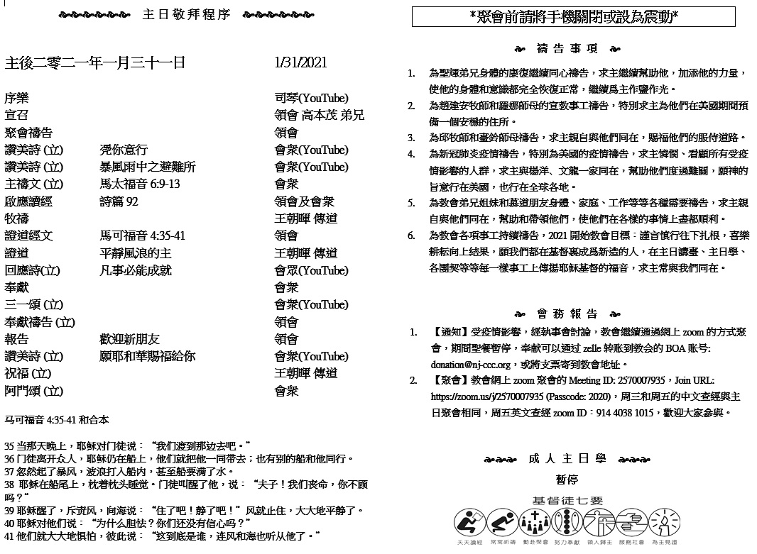 主日崇拜 10:00AM - 11:25 AM  ; 主日学 11:30AM - 12:30PM 青少年 10:00AM - 12:00PM ; 午餐 12:30M - 1:30PM 疫情時期教會的聚會暂时用ZOOM网上聚会型式, 歡迎新老朋友参加! https://zoom.us/j/2570007935 4 “以色列啊,你要听!耶和华我们 神是独一的主。 5 你要尽心、尽性、尽力爱耶和华你的 神。 6 我今日所吩咐你的话都要记在心上, 7 也要殷勤教训你的儿女。无论你坐在家里,行在路上,躺下,起来,都要谈论。 8 也要系在手上为记号,戴在额上为经文; 9 又要写在你房屋的门框上,并你的城门上。” (申命记 6:4-9)