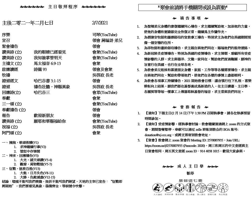 主日崇拜 10:00AM - 11:25 AM  ; 主日学 11:30AM - 12:30PM 青少年 10:00AM - 12:00PM ; 午餐 12:30M - 1:30PM 疫情時期教會的聚會暂时用ZOOM网上聚会型式, 歡迎新老朋友参加! https://zoom.us/j/2570007935 6 你當剛強壯膽!因為你必使這百姓承受那地為業,就是我向他們列祖起誓應許賜給他們的地。 7 只要剛強,大大壯膽,謹守遵行我僕人摩西所吩咐你的一切律法,不可偏離左右,使你無論往哪裏去,都可以順利。 8 這律法書不可離開你的口,總要晝夜思想,好使你謹守遵行這書上所寫的一切話。如此,你的道路就可以亨通,凡事順利。 (約書亞記 1:6-8)