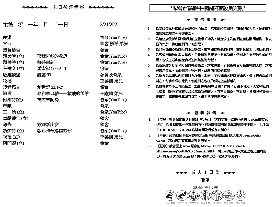 主日崇拜 10:00AM - 11:25 AM  ; 主日学 11:30AM - 12:30PM 青少年 10:00AM - 12:00PM ; 午餐 12:30M - 1:30PM 疫情時期教會的聚會暂时用ZOOM网上聚会型式, 歡迎新老朋友参加! https://zoom.us/j/2570007935 16 路得說:「不要催我回去不跟隨你。你往哪裏去,我也往那裏去;你在哪裏住宿,我也在那裏住宿;你的國就是我的國,你的神就是我的神。 17 你在哪裏死,我也在那裏死,也葬在那裏。除非死能使你我相離!不然,願耶和華重重地降罰與我。」 (路得記 1:16-17)