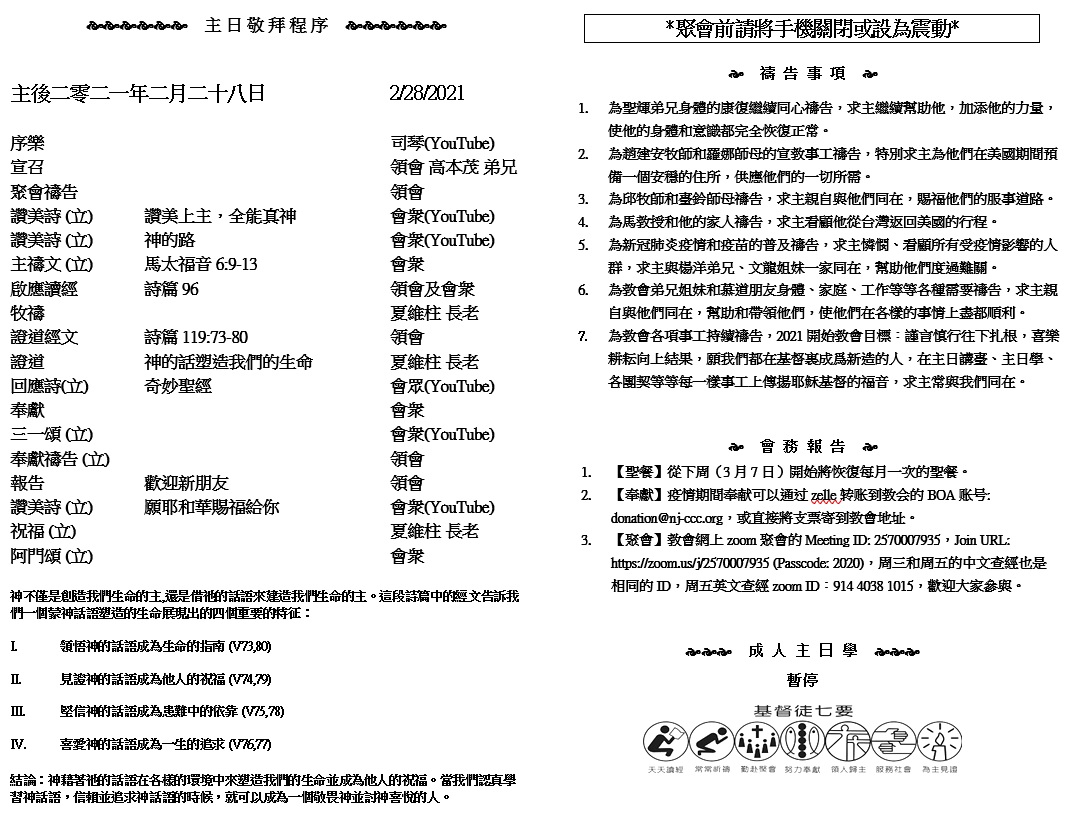 主日崇拜 10:00AM - 11:25 AM  ; 主日学 11:30AM - 12:30PM 青少年 10:00AM - 12:00PM ; 午餐 12:30M - 1:30PM 疫情時期教會的聚會暂时用ZOOM网上聚会型式, 歡迎新老朋友参加! https://zoom.us/j/2570007935 1 哈拿禱告說:我的心因耶和華快樂;我的角因耶和華高舉。我的口向仇敵張開;我因耶和華的救恩歡欣。2 只有耶和華為聖;除他以外沒有可比的,也沒有磐石像我們的神。3 人不要誇口說驕傲的話,也不要出狂妄的言語;因耶和華是大有智識的神,人的行為被他衡量。” (撒母耳記上 2:1-3)