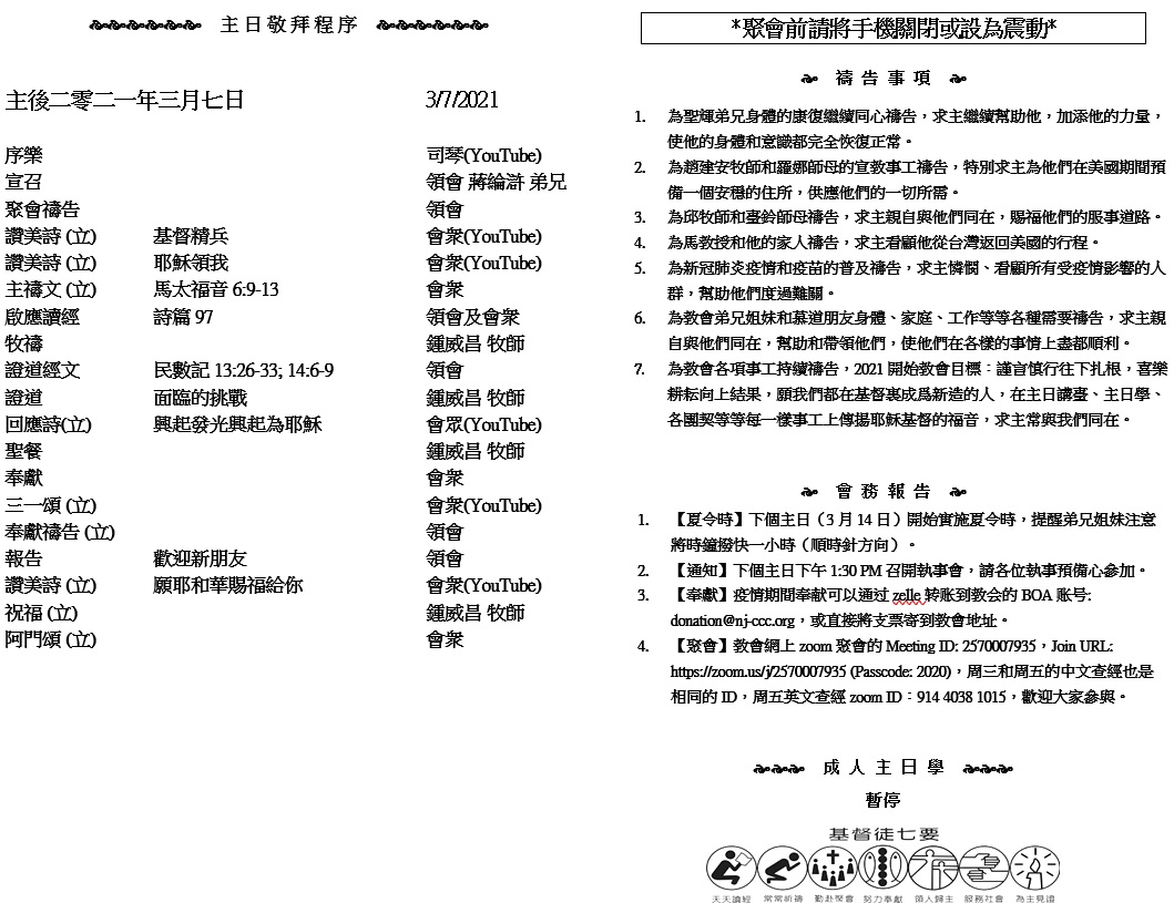 主日崇拜 10:00AM - 11:25 AM  ; 主日学 11:30AM - 12:30PM 青少年 10:00AM - 12:00PM ; 午餐 12:30M - 1:30PM 疫情時期教會的聚會暂时用ZOOM网上聚会型式, 歡迎新老朋友参加! https://zoom.us/j/2570007935 25 「耶和華神啊,你所應許僕人和僕人家的話,求你堅定,直到永遠;照你所說的而行。 26 願人永遠尊你的名為大,說:『萬軍之耶和華是治理以色列的神。』這樣,你僕人大衛的家必在你面前堅立。 27 萬軍之耶和華-以色列的神啊,因你啟示你的僕人說:『我必為你建立家室』,所以僕人大膽向你如此祈禱。” (撒母耳記下 7:25-27)
