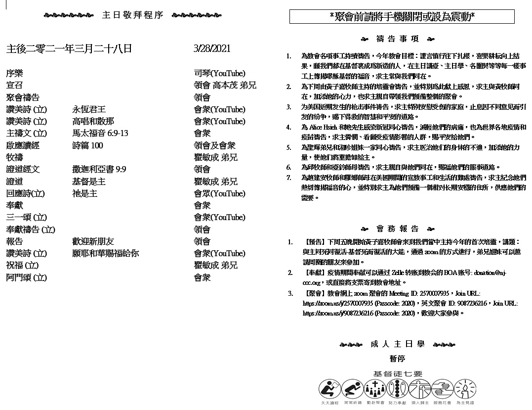 主日崇拜 10:00AM - 11:25 AM  ; 主日学 11:30AM - 12:30PM 青少年 10:00AM - 12:00PM ; 午餐 12:30M - 1:30PM 疫情時期教會的聚會暂时用ZOOM网上聚会型式, 歡迎新老朋友参加! https://zoom.us/j/2570007935 31 愿天欢喜,愿地快乐;愿人在列邦中说:‘耶和华作王了!’32 愿海和其中所充满的澎湃;愿田和其中所有的都欢乐。33 那时,林中的树木都要在耶和华面前欢呼,因为他来要审判全地。34 应当称谢耶和华;因他本为善,他的慈爱永远长存!” (历代志上 16:31-34)