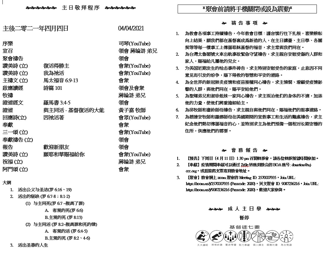 主日崇拜 10:00AM - 11:25 AM  ; 主日学 11:30AM - 12:30PM 青少年 10:00AM - 12:00PM ; 午餐 12:30M - 1:30PM 疫情時期教會的聚會暂时用ZOOM网上聚会型式, 歡迎新老朋友参加! https://zoom.us/j/2570007935 11 神对所罗门说:“我已立你作我民的王。你既有这心意,并不求资财、丰富、尊荣,也不求灭绝那恨你之人的性命,又不求大寿数,只求智慧聪明好判断我的民; 12 我必赐你智慧聪明,也必赐你资财、丰富、尊荣。在你以前的列王都没有这样,在你以后也必没有这样的。” (历代志下 1:11-12)