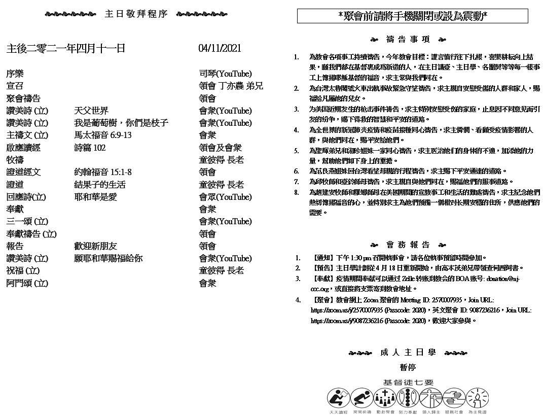 主日崇拜 10:00AM - 11:25 AM  ; 主日学 11:30AM - 12:30PM 青少年 10:00AM - 12:00PM ; 午餐 12:30M - 1:30PM 疫情時期教會的聚會暂时用ZOOM网上聚会型式, 歡迎新老朋友参加! https://zoom.us/j/2570007935 27 以斯拉說:「耶和華-我們列祖的神是應當稱頌的!因他使王起這心意修飾耶路撒冷耶和華的殿, 28 又在王和謀士,並大能的軍長面前施恩於我。因耶和華-我神的手幫助我,我就得以堅強,從以色列中招聚首領,與我一同上來。 (以斯拉記 7:27-2)
