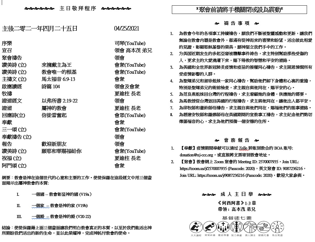 主日崇拜 10:00AM - 11:25 AM  ; 主日学 11:30AM - 12:30PM 青少年 10:00AM - 12:00PM ; 午餐 12:30M - 1:30PM 疫情時期教會的聚會暂时用ZOOM网上聚会型式, 歡迎新老朋友参加! https://zoom.us/j/2570007935 20 末底改記錄這事,寫信與亞哈隨魯王各省遠近所有的猶大人, 21 囑咐他們每年守亞達月十四、十五兩日, 22 以這月的兩日為猶大人脫離仇敵得平安、轉憂為喜、轉悲為樂的吉日。在這兩日設筵歡樂,彼此餽送禮物,賙濟窮人。 (以斯帖記 9:20-22)