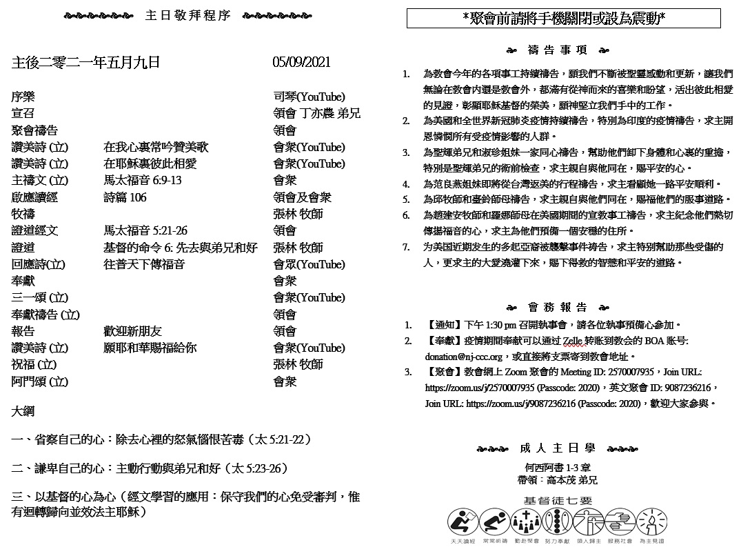 主日崇拜 10:00AM - 11:25 AM  ; 主日学 11:30AM - 12:30PM 青少年 10:00AM - 12:00PM ; 午餐 12:30M - 1:30PM 疫情時期教會的聚會暂时用ZOOM网上聚会型式, 歡迎新老朋友参加! https://zoom.us/j/2570007935 1 不从恶人的计谋,不站罪人的道路,不坐亵慢人的座位,2 惟喜爱耶和华的律法,昼夜思想,这人便为有福!3 他要像一棵树栽在溪水旁,按时候结果子,叶子也不枯干。凡他所做的尽都顺利。 (诗篇 1:1-3)