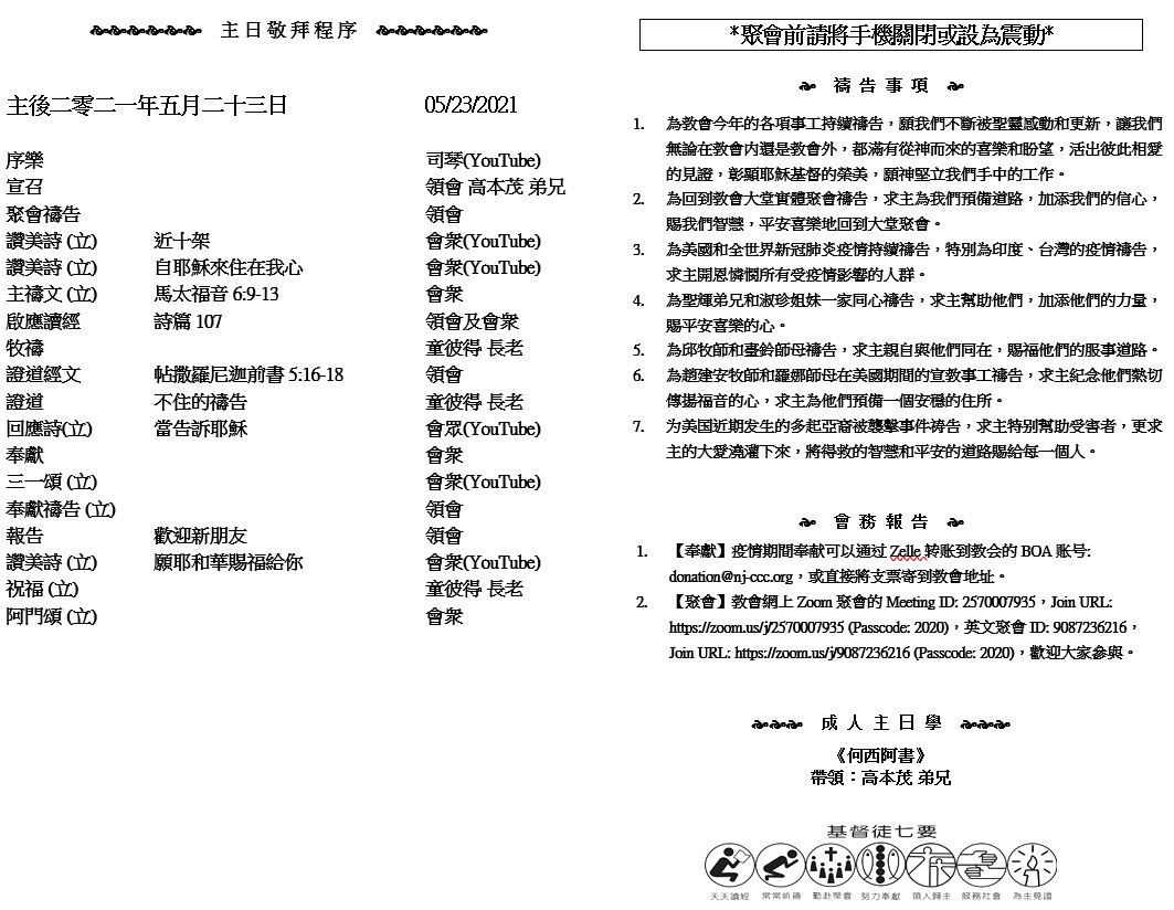 主日崇拜 10:00AM - 11:25 AM  ; 主日学 11:30AM - 12:30PM 青少年 10:00AM - 12:00PM ; 午餐 12:30M - 1:30PM 疫情時期教會的聚會暂时用ZOOM网上聚会型式, 歡迎新老朋友参加! https://zoom.us/j/2570007935 14 我知道 神一切所做的都必永存;无所增添,无所减少。 神这样行,是要人在他面前存敬畏的心。 15 现今的事早先就有了,将来的事早已也有了,并且 神使已过的事重新再来)。 (传道书 3:14-15)