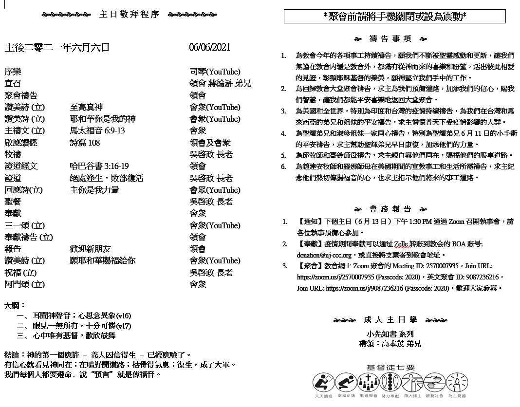 主日崇拜 10:00AM - 11:25 AM  ; 主日学 11:30AM - 12:30PM 青少年 10:00AM - 12:00PM ; 午餐 12:30M - 1:30PM 疫情時期教會的聚會暂时用ZOOM网上聚会型式, 歡迎新老朋友参加! https://zoom.us/j/2570007935 18 耶和華說:你們來,我們彼此辯論。你們的罪雖像硃紅,必變成雪白;雖紅如丹顏,必白如羊毛。19 你們若甘心聽從,必吃地上的美物,20 若不聽從,反倒悖逆,必被刀劍吞滅。這是耶和華親口說的。 (以賽亞書 1:18-20)