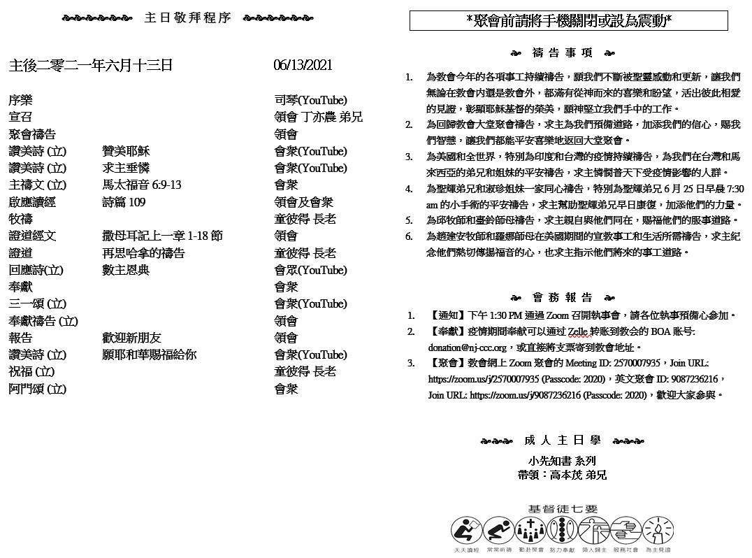 主日崇拜 10:00AM - 11:25 AM  ; 主日学 11:30AM - 12:30PM 青少年 10:00AM - 12:00PM ; 午餐 12:30M - 1:30PM 疫情時期教會的聚會暂时用ZOOM网上聚会型式, 歡迎新老朋友参加! https://zoom.us/j/2570007935 18 看哪,我今日使你成为坚城、铁柱、铜墙,与全地和犹大的君王、首领、祭司,并地上的众民反对。 19 他们要攻击你,却不能胜你;因为我与你同在,要拯救你。这是耶和华说的。” (耶利米书 1:18-19)