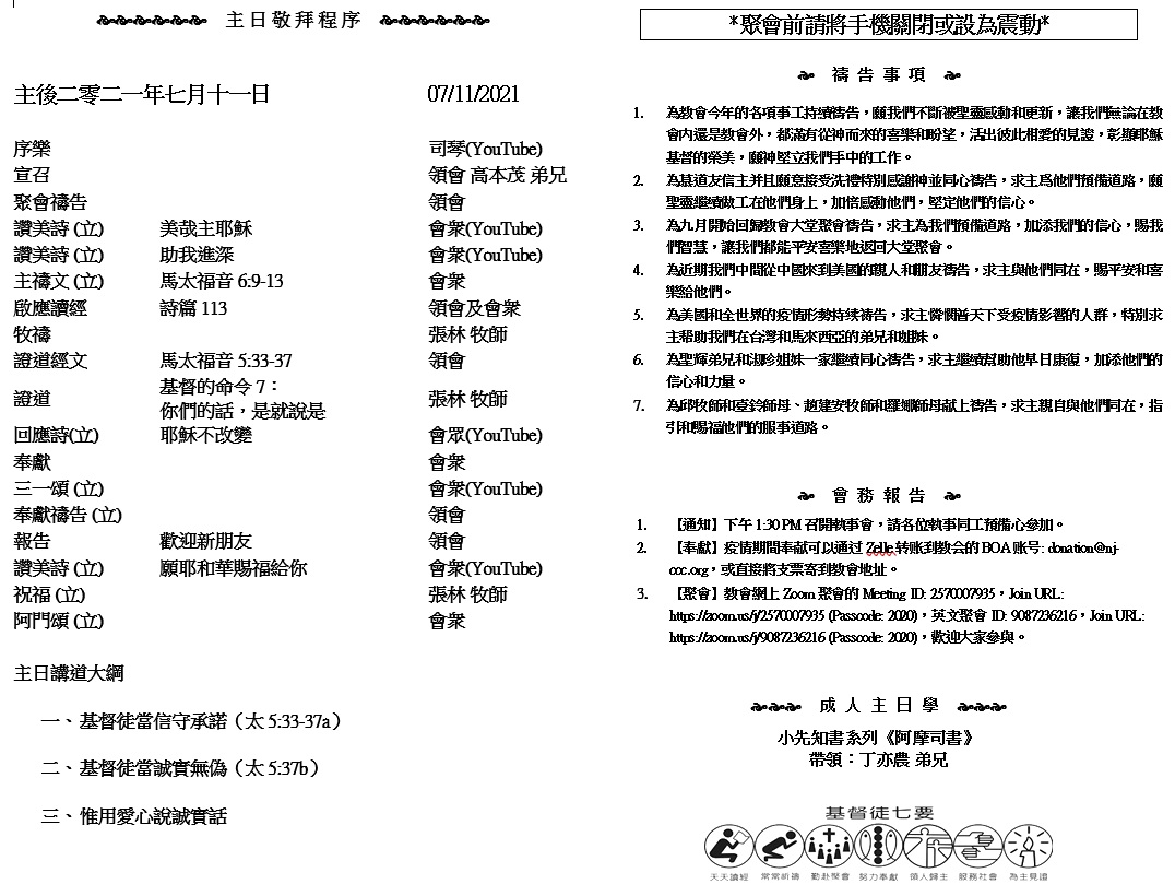 主日崇拜 10:00AM - 11:25 AM  ; 主日学 11:30AM - 12:30PM 青少年 10:00AM - 12:00PM ; 午餐 12:30M - 1:30PM 疫情時期教會的聚會暂时用ZOOM网上聚会型式, 歡迎新老朋友参加! https://zoom.us/j/2570007935 21 耶和華說:那日我必應允,我必應允天,天必應允地;22 地必應允五穀、新酒,和油,這些必應允耶斯列民(耶斯列就是神栽種的意思)。23 我必將她種在這地。素不蒙憐憫的,我必憐憫;本非我民的,我必對他說:你是我的民;他必說:你是我的神。 (何西阿書 2:21-23)