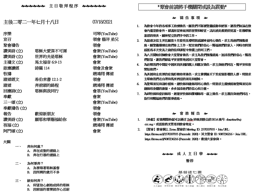 主日崇拜 10:00AM - 11:25 AM  ; 主日学 11:30AM - 12:30PM 青少年 10:00AM - 12:00PM ; 午餐 12:30M - 1:30PM 疫情時期教會的聚會暂时用ZOOM网上聚会型式, 歡迎新老朋友参加! https://zoom.us/j/2570007935 30 「在天上地下,我要顯出奇事,有血,有火,有煙柱。 31 日頭要變為黑暗,月亮要變為血,這都在耶和華大而可畏的日子未到以前。 32 到那時候,凡求告耶和華名的就必得救;因為照耶和華所說的,在錫安山,耶路撒冷必有逃脫的人,在剩下的人中必有耶和華所召的。」 (約珥書 2:30-32)