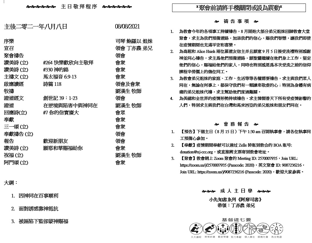 主日崇拜 10:00AM - 11:25 AM  ; 主日学 11:30AM - 12:30PM 青少年 10:00AM - 12:00PM ; 午餐 12:30M - 1:30PM 疫情時期教會的聚會实体和ZOOM网上同步举行, 歡迎新老朋友参加! https://zoom.us/j/2570007935 10 耶和華說:「這蓖麻不是你栽種的,也不是你培養的;一夜發生,一夜乾死,你尚且愛惜; 11 何況這尼尼微大城,其中不能分辨左手右手的有十二萬多人,並有許多牲畜,我豈能不愛惜呢?」 (約拿書 4:10-11)