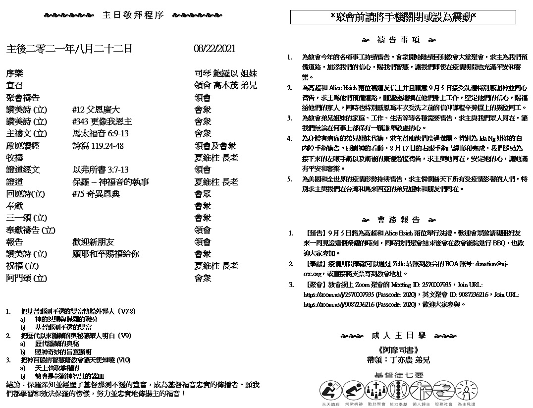主日崇拜 10:00AM - 11:25 AM  ; 主日学 11:30AM - 12:30PM 青少年 10:00AM - 12:00PM ; 午餐 12:30M - 1:30PM 疫情時期教會的聚會实体和ZOOM网上同步举行, 歡迎新老朋友参加! https://zoom.us/j/2570007935 2 耶和華是忌邪施報的神。耶和華施報大有忿怒;向他的敵人施報,向他的仇敵懷怒。3 耶和華不輕易發怒,大有能力,萬不以有罪的為無罪。他乘旋風和暴風而來,雲彩為他腳下的塵土。 (那鴻書 1:2-3)