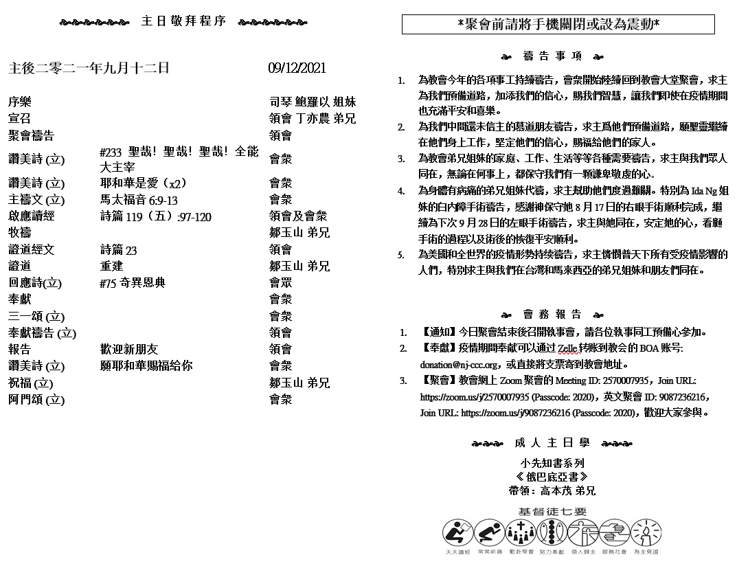 主日崇拜 10:00AM - 11:25 AM  ; 主日学 11:30AM - 12:30PM 青少年 10:00AM - 12:00PM ; 午餐 12:30M - 1:30PM 疫情時期教會的聚會实体和ZOOM网上同步举行, 歡迎新老朋友参加! https://zoom.us/j/2570007935 3 你們中間存留的,有誰見過這殿從前的榮耀呢?現在你們看着如何?豈不在眼中看如無有嗎?」 4 耶和華說:「所羅巴伯啊,雖然如此,你當剛強!約撒答的兒子大祭司約書亞啊,你也當剛強!這地的百姓,你們都當剛強做工,因為我與你們同在。這是萬軍之耶和華說的。 (哈該書2:3-4)