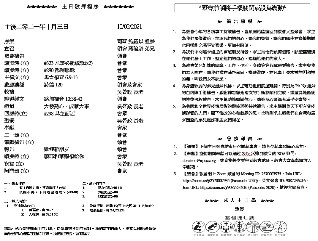 主日崇拜 10:00AM - 11:25 AM  ; 主日学 11:30AM - 12:30PM 青少年 10:00AM - 12:00PM ; 午餐 12:30M - 1:30PM 疫情時期教會的聚會实体和ZOOM网上同步举行, 歡迎新老朋友参加! https://zoom.us/j/2570007935 21 她將要生一個兒子,你要給他起名叫耶穌,因他要將自己的百姓從罪惡裏救出來。」 22 這一切的事成就是要應驗主藉先知所說的話, 23 說: 必有童女懷孕生子;人要稱他的名為以馬內利。(以馬內利翻出來就是「神與我們同在」。)」 (馬太福音1:21-23)
