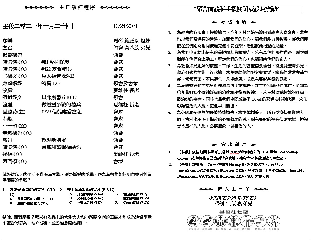 主日崇拜 10:00AM - 11:25 AM  ; 主日学 11:30AM - 12:30PM 青少年 10:00AM - 12:00PM ; 午餐 12:30M - 1:30PM 疫情時期教會的聚會实体和ZOOM网上同步举行, 歡迎新老朋友参加! https://zoom.us/j/2570007935 1 太初有道,道與神同在,道就是神。 2 這道太初與神同在。 3 萬物是藉着他造的;凡被造的,沒有一樣不是藉着他造的。 4 生命在他裏頭,這生命就是人的光。 5 光照在黑暗裏,黑暗卻不接受光。 (約翰福音1:1-5)